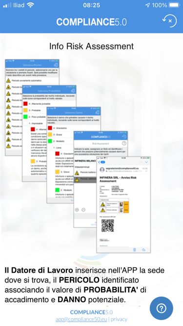 Il D.Lgs. 81/08 smi Testo Unico sulla Salute e Sicurezza nei Luoghi di Lavoro, stabilisce che il Datore di Lavoro valuta tutti i rischi e redige il relativo documento (artt. 17 e 28). Attraverso una procedura che fa riferimento alla UNI ISO 31000 - Gestione del Rischio,, il Datore di Lavoro si porta davanti alla macchina, l'impianto, l'elemento da valutare, inserisce nell'APP la sede dove si trova, inserisce un TITOLO, identifica i PERICOLI attraverso la scelta di semplici cartelli, associa il livello di rischio scegliendo tra PROBABILITA' e DANNO e una volta conclusi questi semplici passi, invia con un tocco una tabella a tutto l'SPP in modo che possa integrare specifiche attività di Prevenzione e Protezione con Procedure e Ordini di Lavoro. L'APP genera un QRCode associandolo alla Tabella così creata. Il codice elettronico viene stampato con apposite etichette ed associato alla tabella così creata. In questo modo, attraverso la funzione specifica dell'APP, il Tecnico, il Manutentore, il Lavoratore o chi di dovere potrà consultare la Valutazione del Rischio, scaricare i documenti associati, verificare eventuali note di attenzione per poter svolgere il proprio lavoro in sicurezza ricevendo le informazioni necessarie direttamente sul suo smartphone.